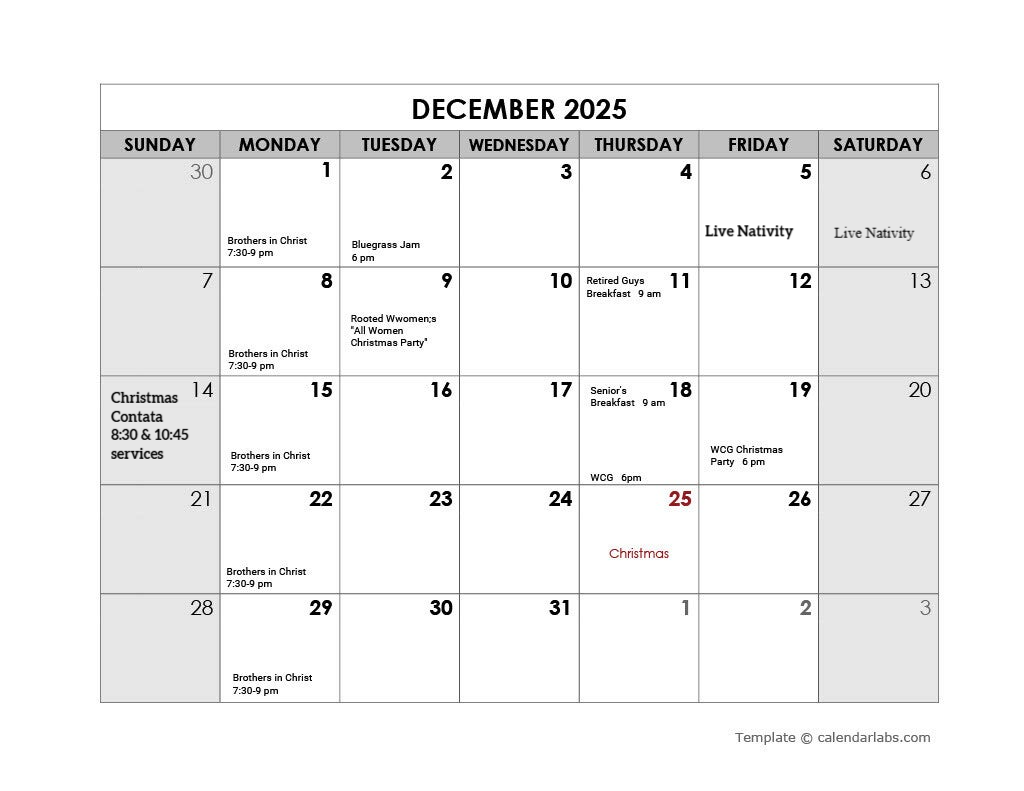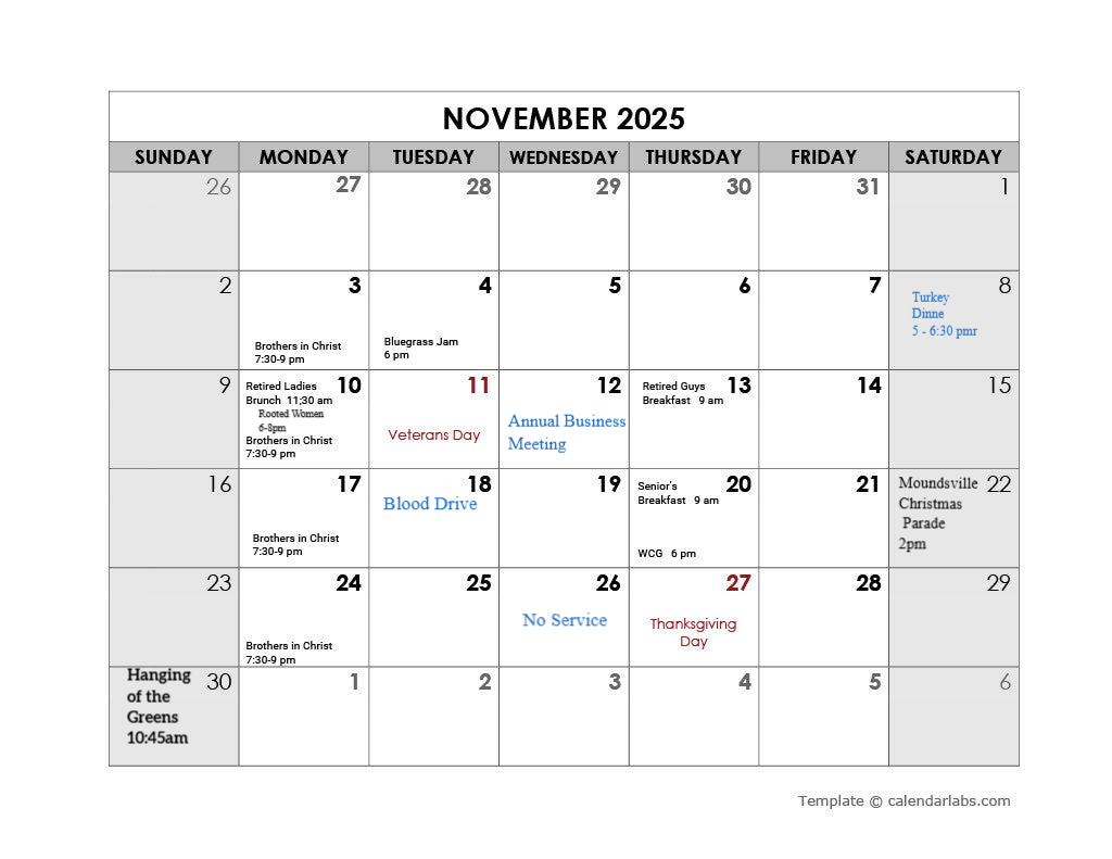 Monthly Calendar of Events